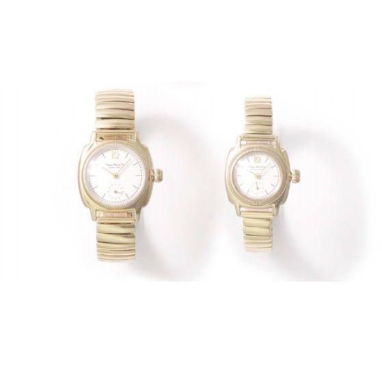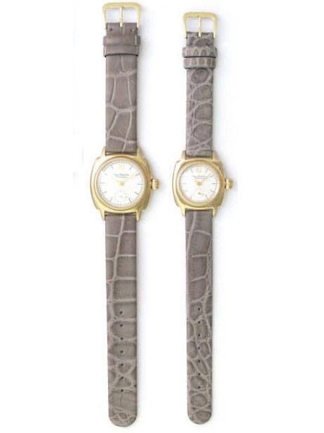 メンズサイズはグレーのクロコダイルベルト、レディースサイズはエクステンションベルトで本体カラーはどちらもイエローゴールド。装いによって2つの時計を素敵に使い分けていただいております。