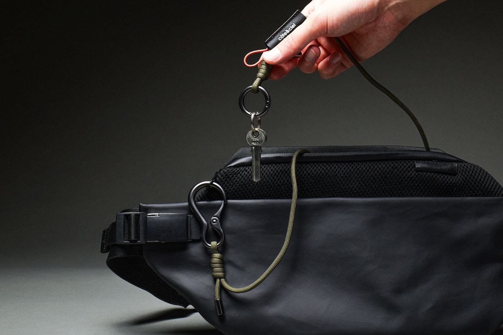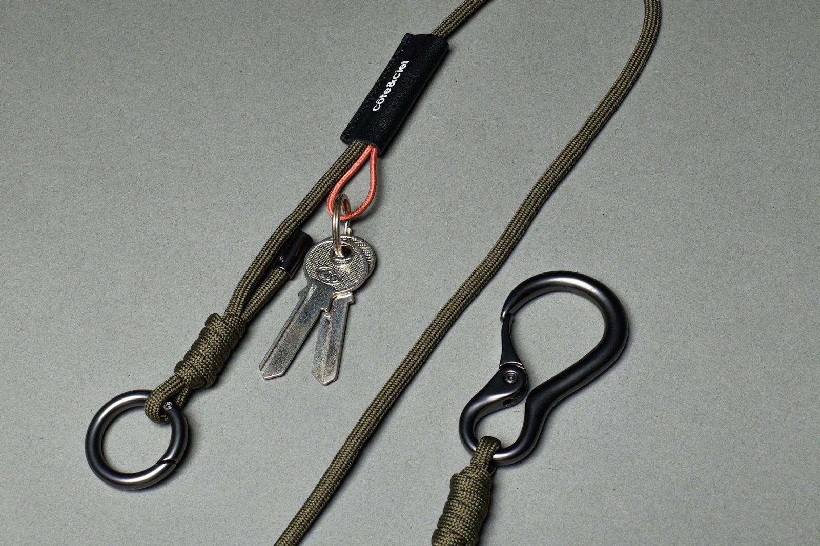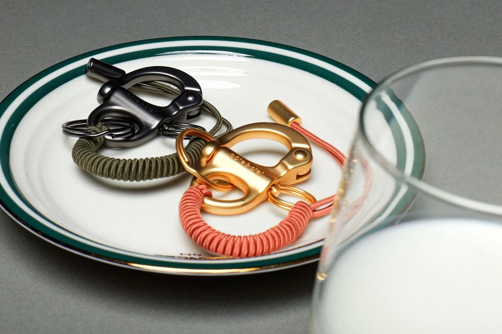 片側に鍵を取り付け、もう片方のカラビナをバッグのハンドルやDカンに留めれば、必要なときにコードを手繰るだけで瞬時にアクセス。
