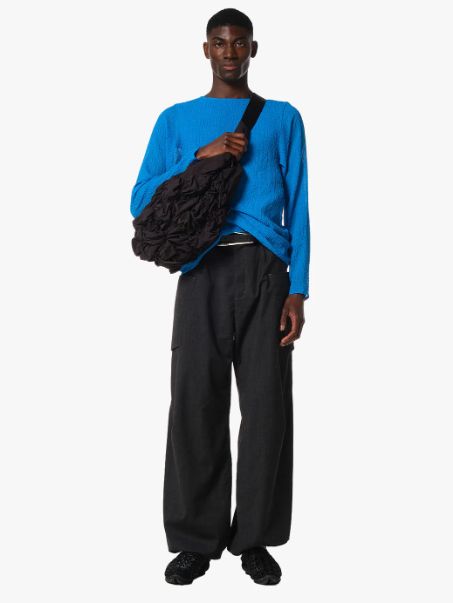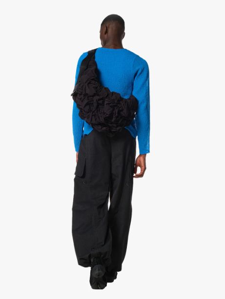 柔らかく寄せられたドレープが陰影を生み、静かな存在感を放つ彫刻的フォルムに。軽やかでありながら奥行きのある質感が、日常の装いにモダンなアクセントを加えます。