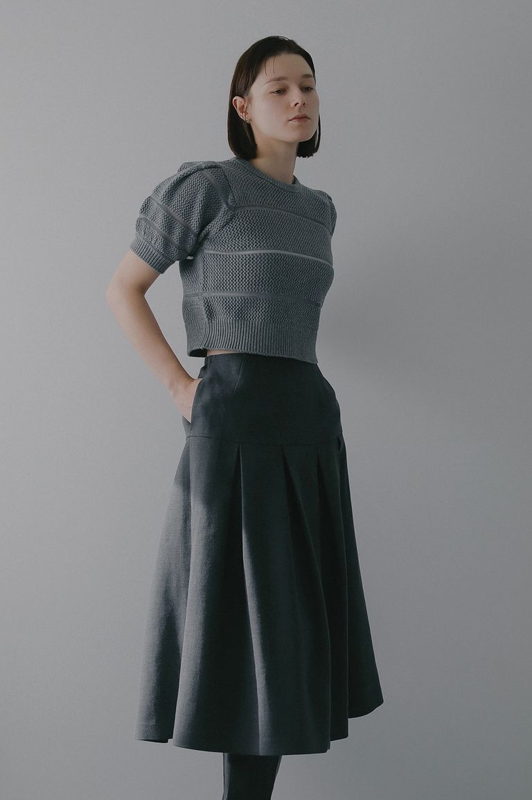 コットン混のしっかりとしたニット部分と、透け感のあるシアー部分のバランスが、メリハリのあるデザインに仕上げています。