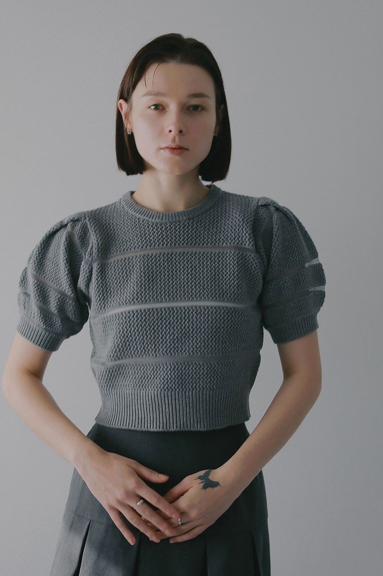透かし編みにシアー切り替えのボーダーを組み合わせた、軽やかなショート丈ニットトップス。