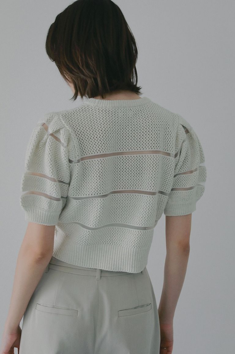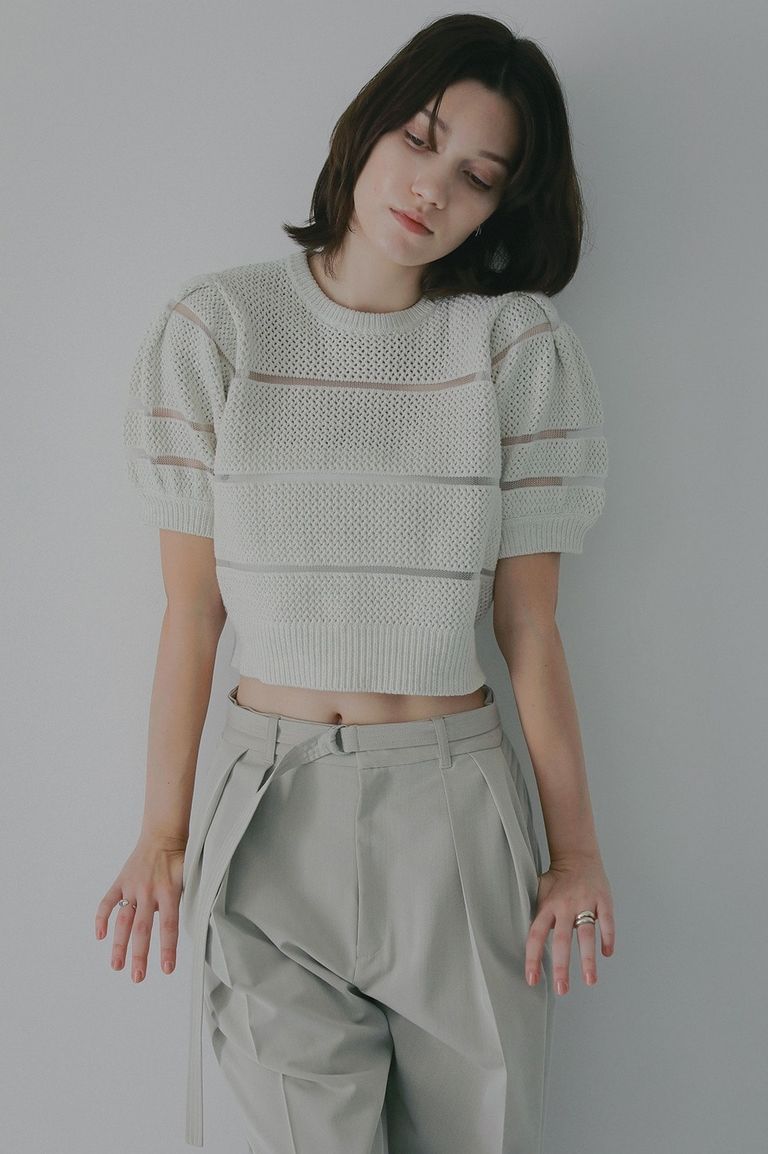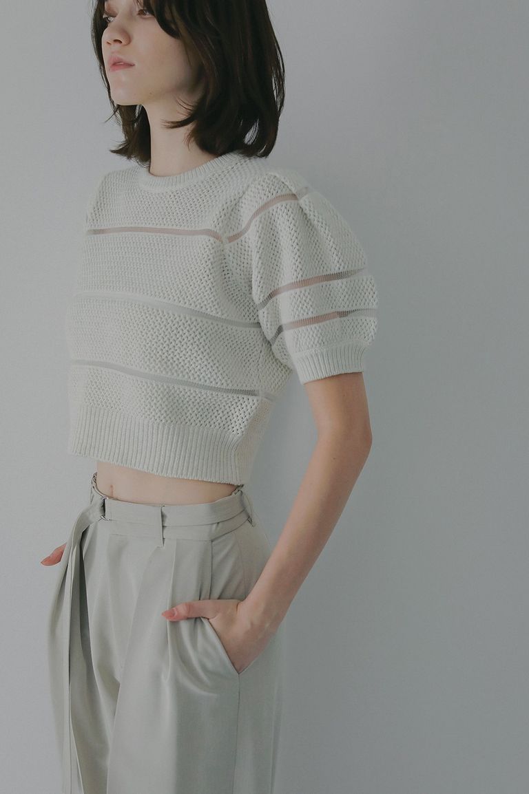透かし編みにシアー切り替えのボーダーを組み合わせた、軽やかなショート丈ニットトップス。