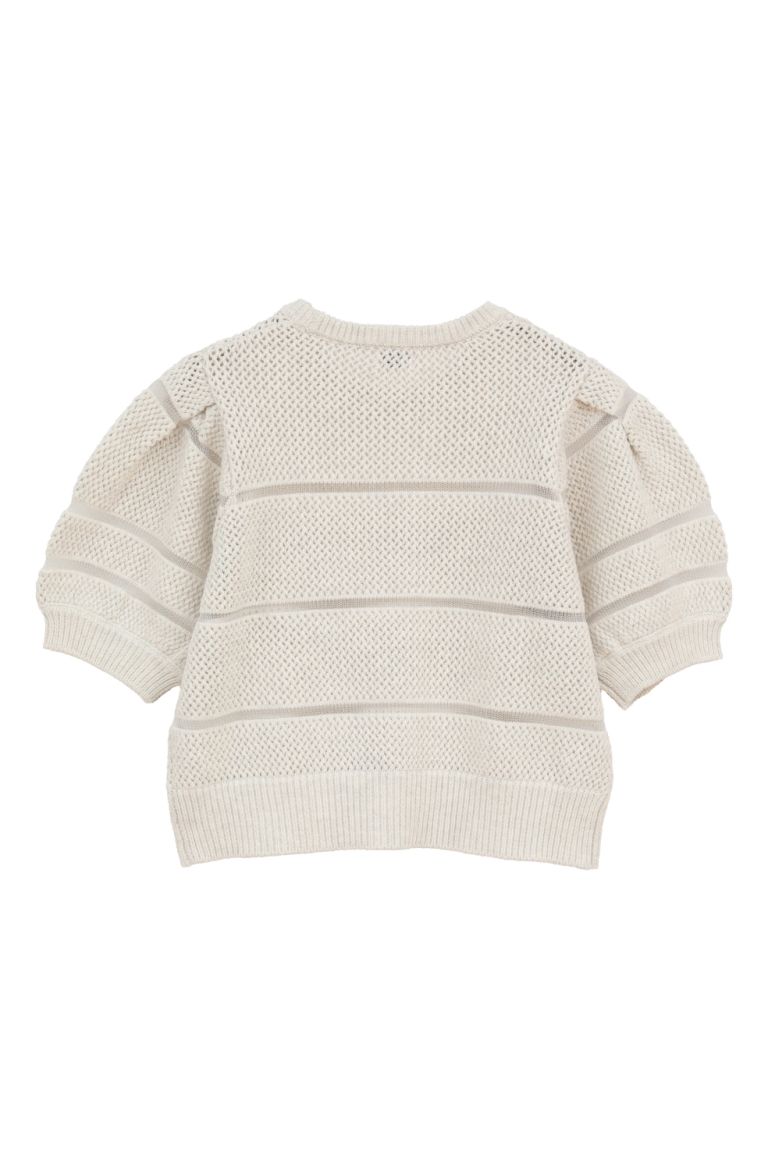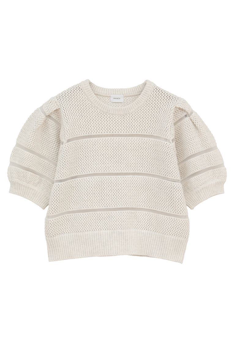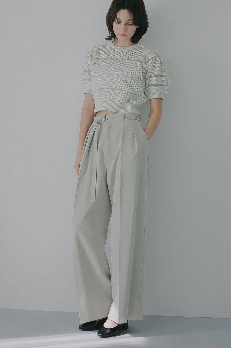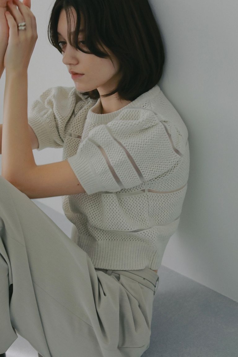 透かし編みにシアー切り替えのボーダーを組み合わせた、軽やかなショート丈ニットトップス。