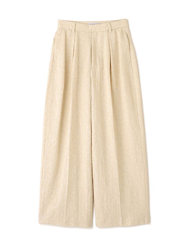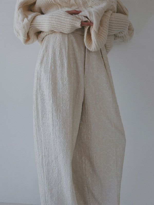 奥行きあるジャガード素材とカーブシルエットが際立つ、モードなデザインパンツ。