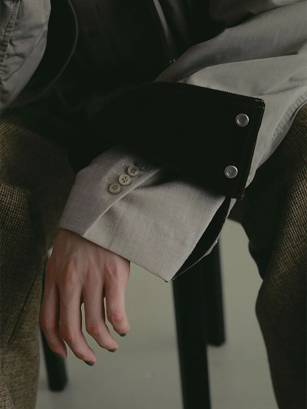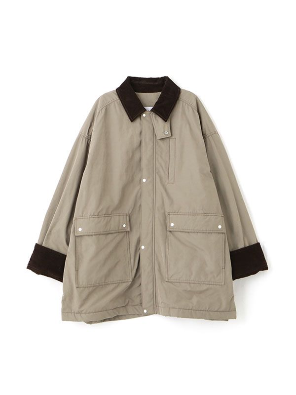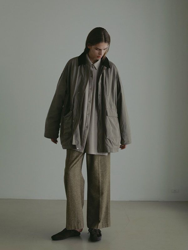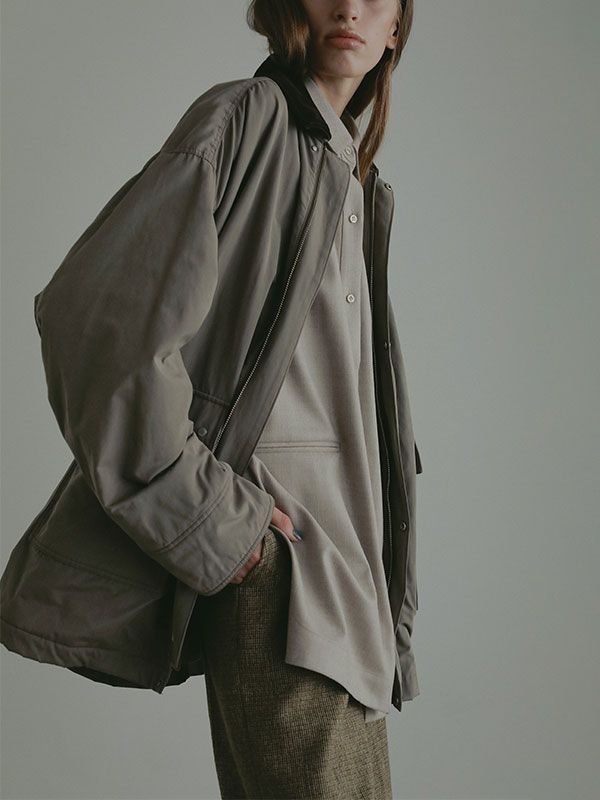 裏地には軽やかなフリースを使用し、見た目以上の保温性と快適な着心地を実現。ボックスシルエットは程よくゆとりがあり、重ね着してももたつかず、秋冬のレイヤードに最適です。襟と袖口裏にはコーデュロイを切り替えで配し、ワントーンの中に奥行きを生むアクセントをプラスしました。