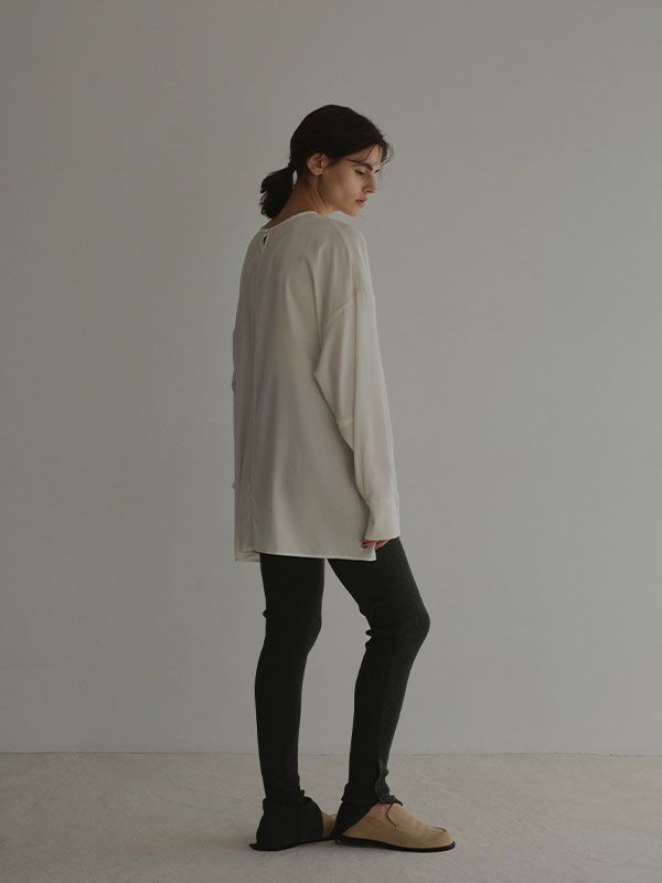 ゆったりとしたオーバーサイズシルエットが生む、余白のあるバランスが魅力。サイドスリットやカフス仕様の袖口など、細部にさりげないデザイン性を加えることで、一枚で着ても、レイヤードしてもサマになる仕上がりです。
