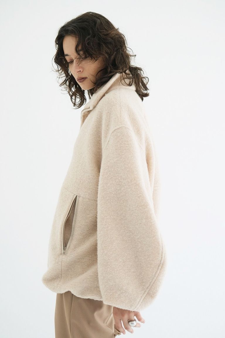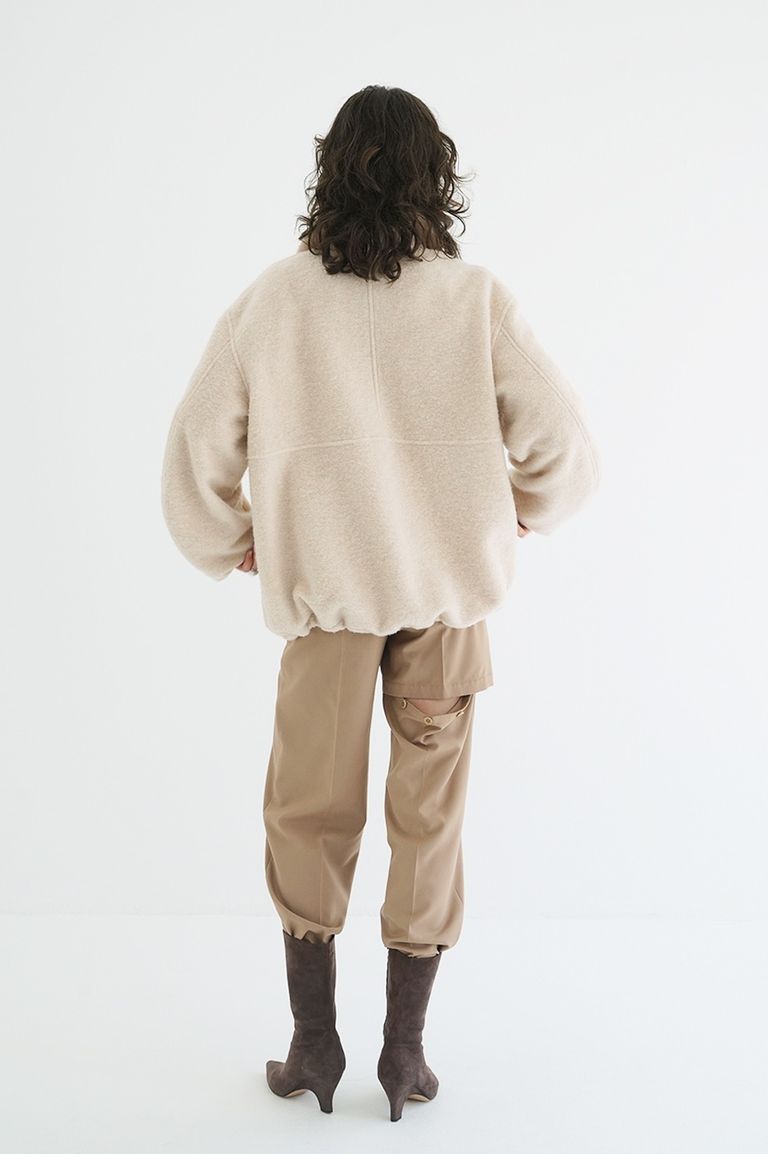 襟元・袖口・ポケット口には配色をさりげなく施し、シンプルな中に洗練されたアクセントをプラス。メンズライクなハーフジップデザインを、CLANEらしい構築的なパターンで仕上げることで、カジュアルながらもモードな印象に。