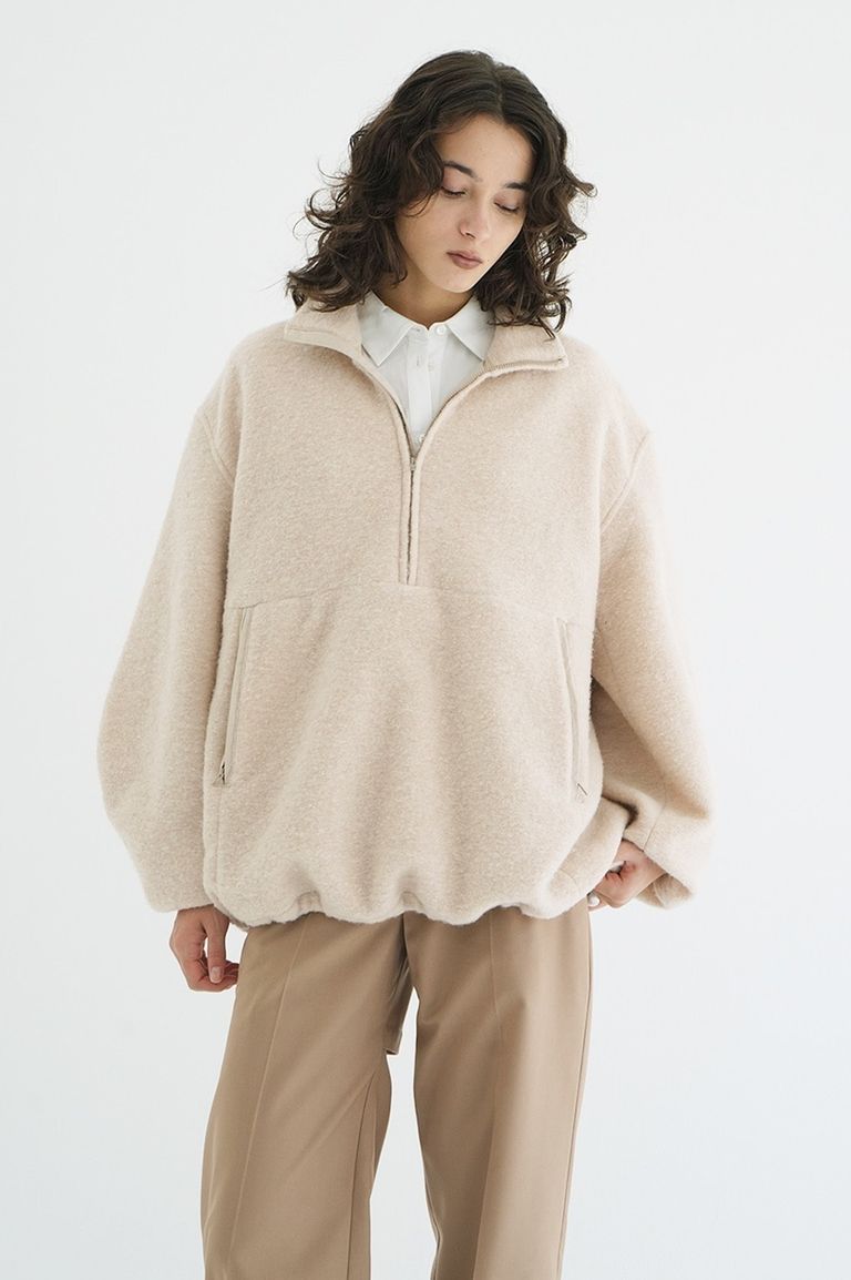 ウール混のスライバーニットを使用した、バルキーなハーフジップトップス。杢調の奥行きある色味が魅力で、シックで重厚感のある表情を持ちながら、軽くて暖かい着心地を実現した一着です。ふくらみのある柔らかな風合いは、アウター感覚でも着用できるほどの存在感があります。