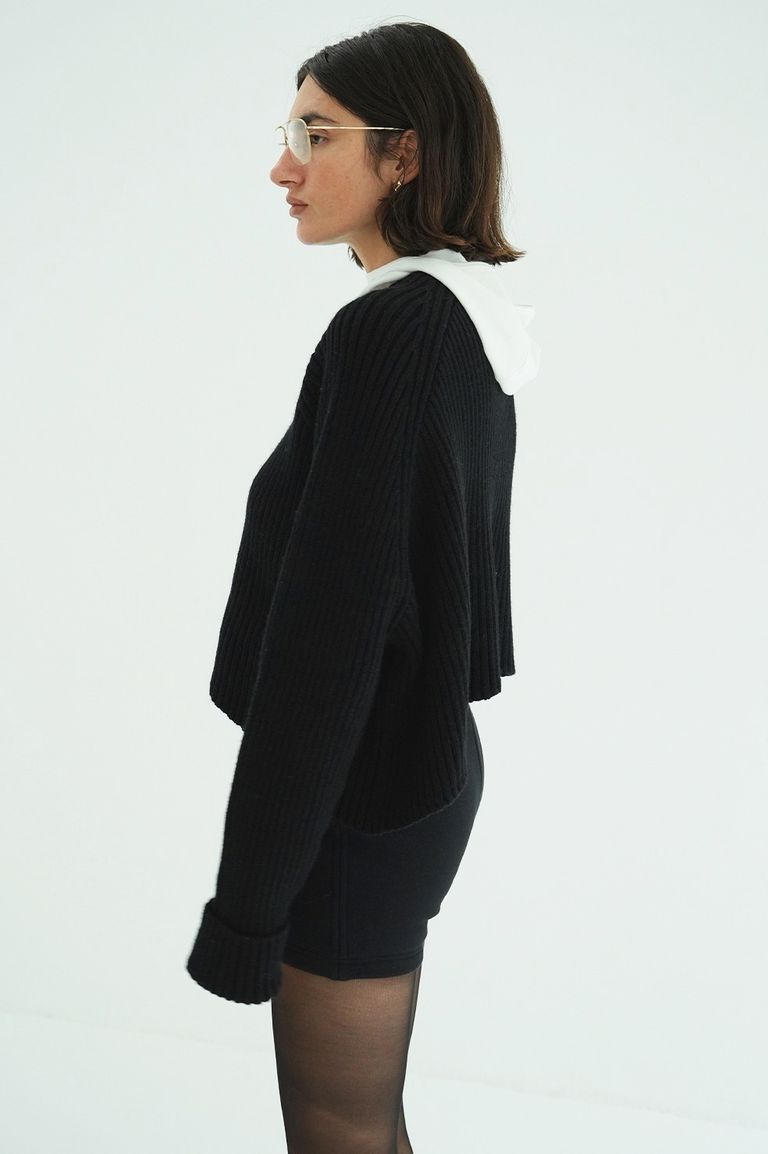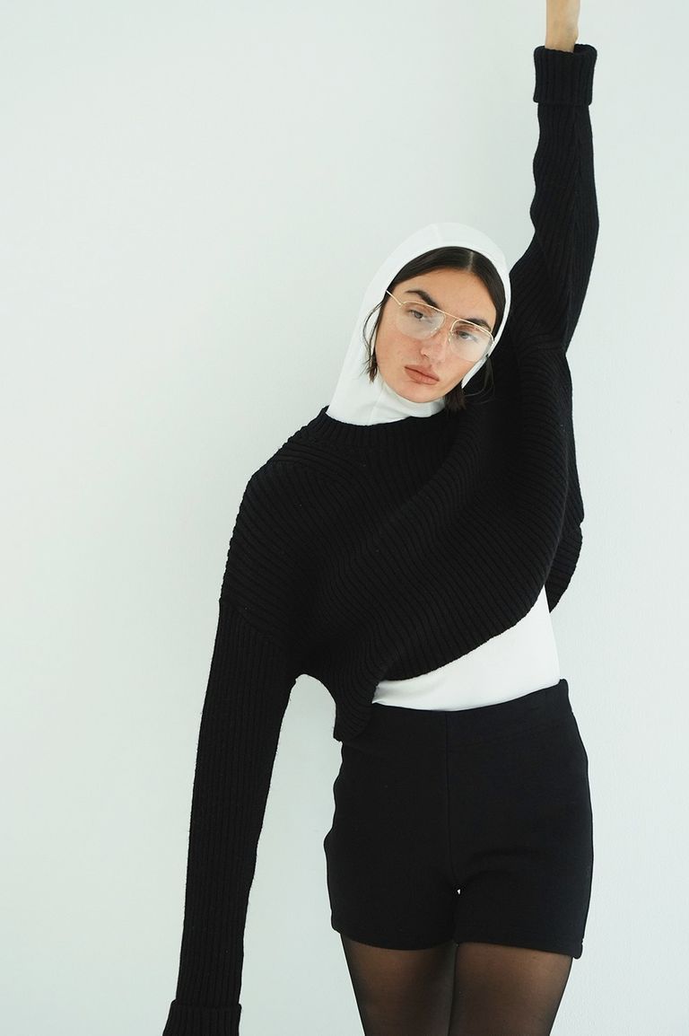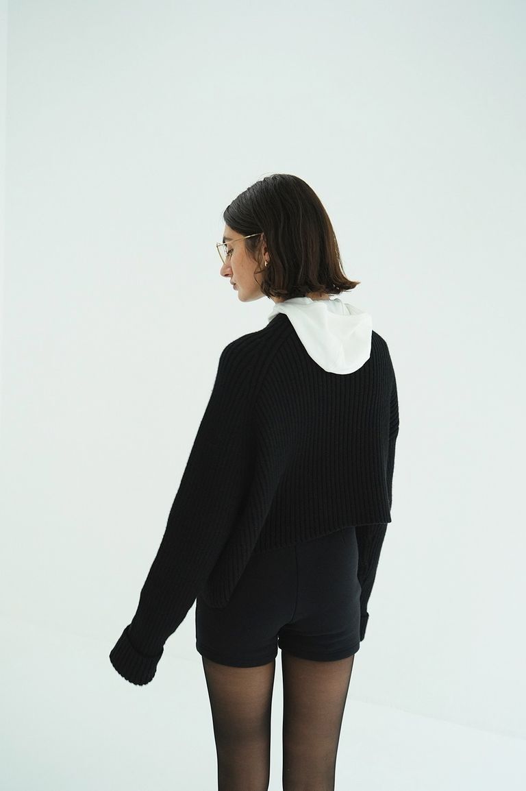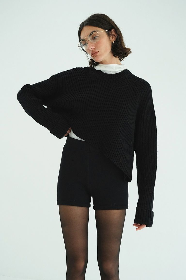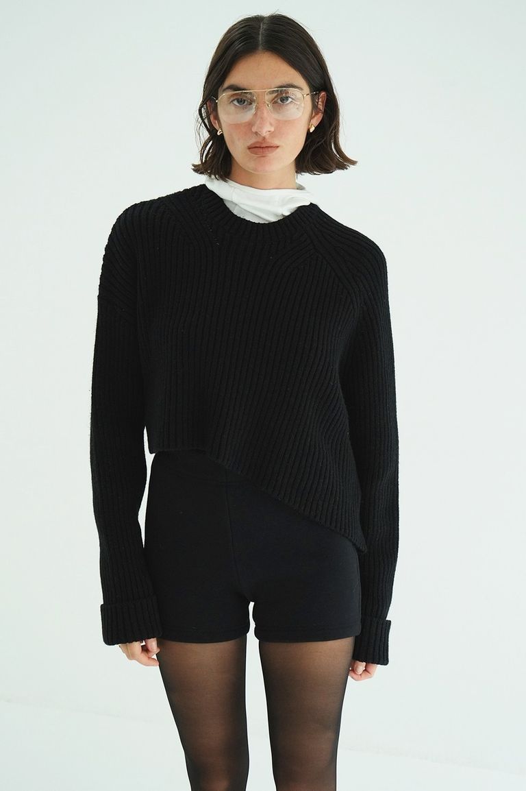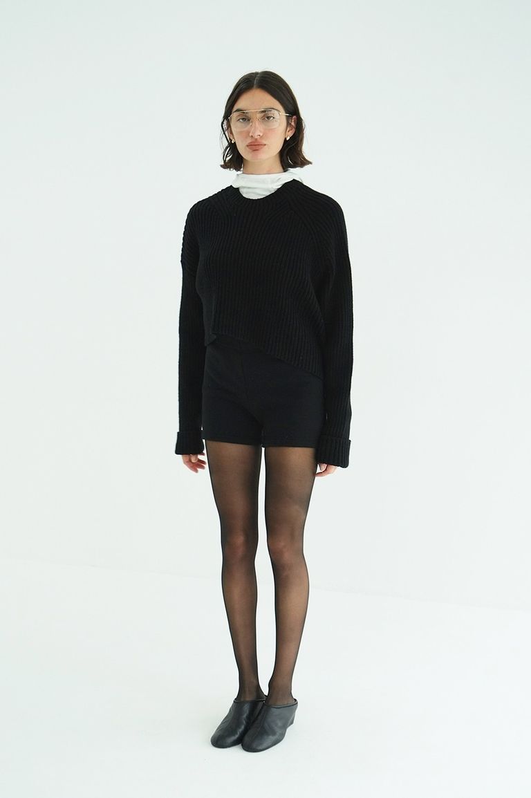 アシンメトリーショートニットトップス - ASYMMETRY WIDE SHORT KNIT TOPS (BLACK)