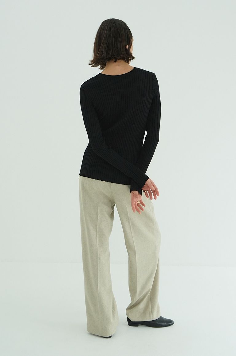 縦のラインを強調するワイドリブにより、全体をすっきりと見せてくれるシルエット。