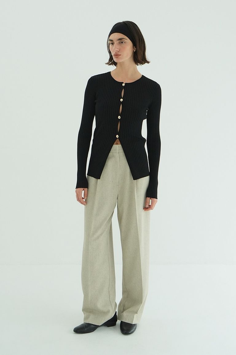 コロンとしたゴールドボタンがさりげないアクセントとなる、ワイドリブニット。