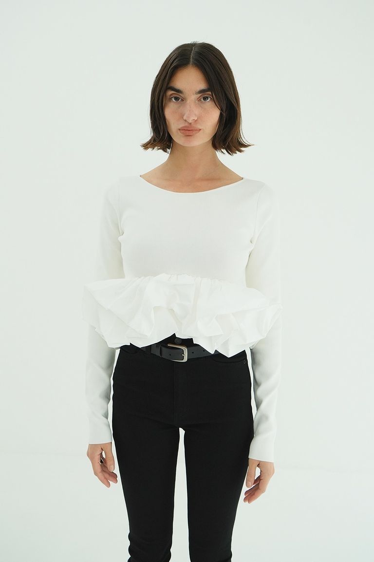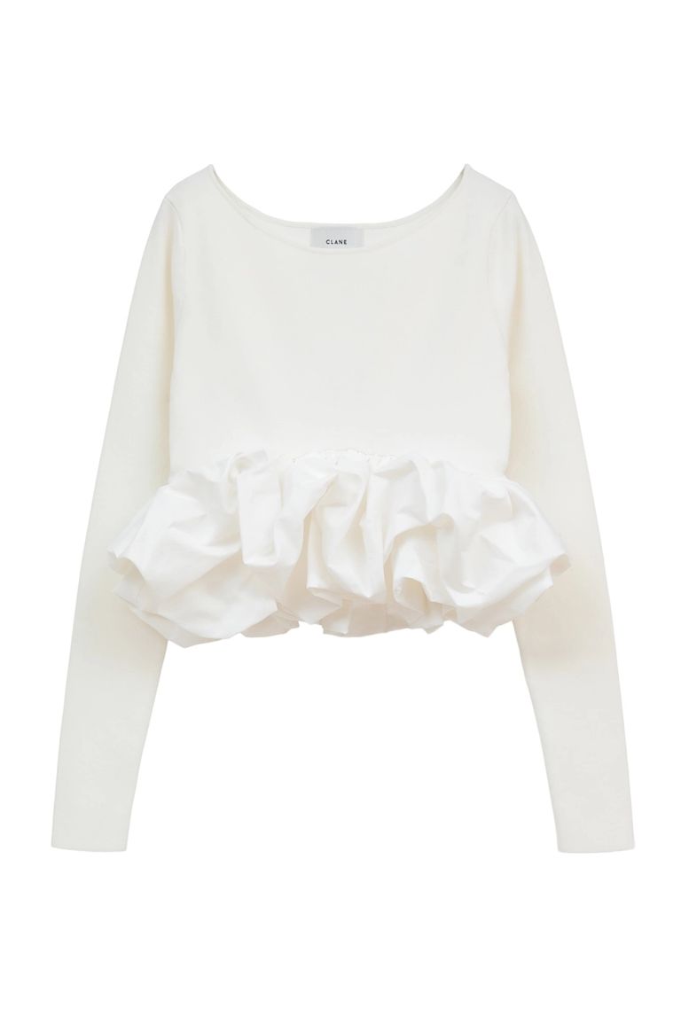 コンパクトなトップス部分に、程よい艶感とハリのある素材で仕上げたバルーンペプラムを組み合わせ、存在感のある一着に仕上げています。