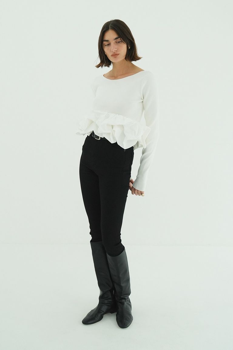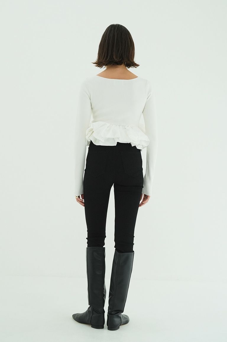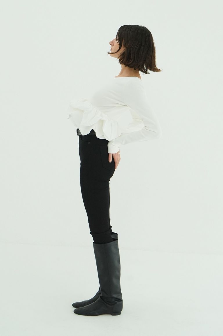 高めの位置から切り替えたペプラムデザインが、自然なスタイルアップを実現。
