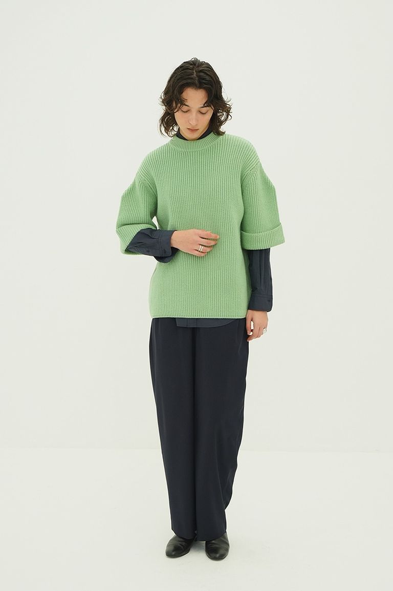バルキーなサイズ感と、袖の立体的なシルエットが印象的なニットトップス。