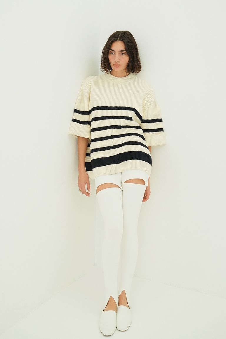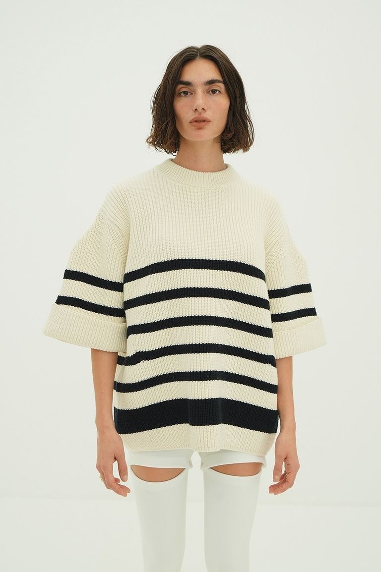 編み地はローゲージの片畔編みを採用し、半袖ながらもニットらしい奥行きと存在感のある仕上がりに。